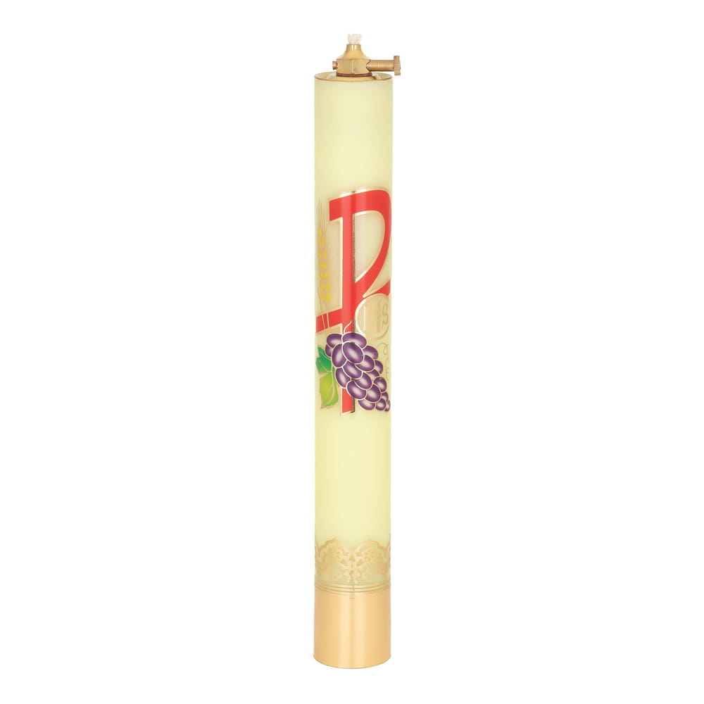 Starannie wykonana żółta, plastikowa świeca z aplikacją eucharystyczną.