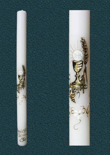 Świeca pierwszokomunijna z naklejką, ręcznie zdobiona.