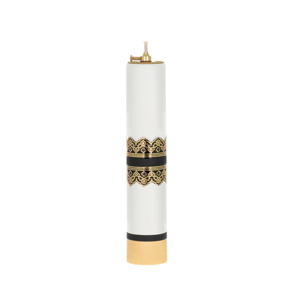 Świeca w kolorze białym z delikatnym zdobieniem czarno - złotym, wykonana trwale z tworzywa sztucznego.