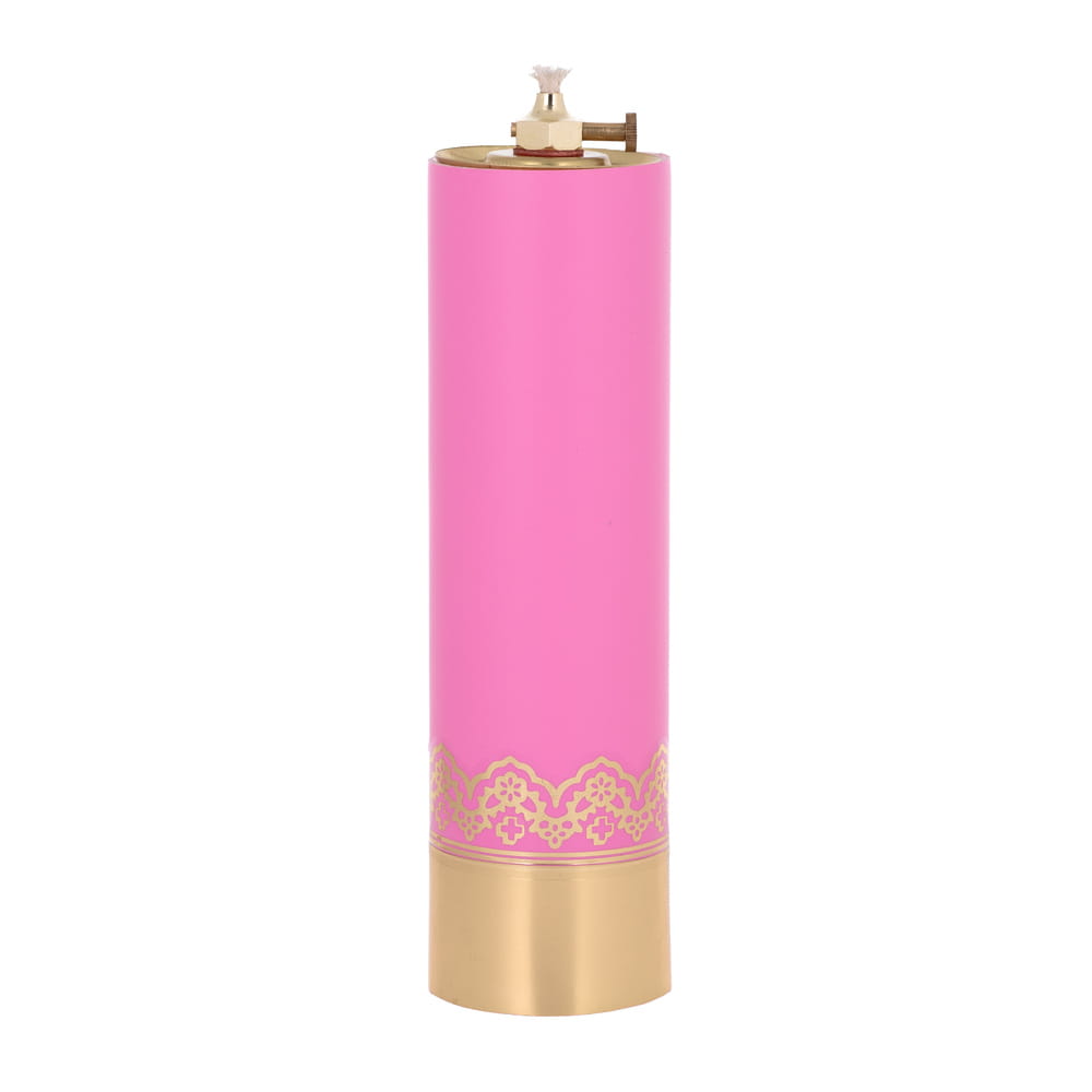 Świeca w kolorze różowym z delikatnym zdobieniem, wykonana trwale z tworzywa sztucznego.