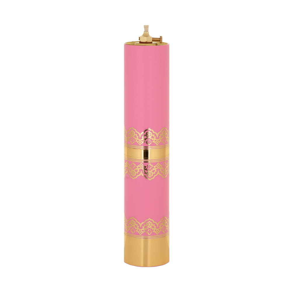 Świeca w kolorze różowym z delikatnym zdobieniem, wykonana trwale z tworzywa sztucznego.