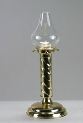 Lichtarz tzw. akolitka z polerowanego mosiądzu na wysoki połysk i zabezpieczane specjalnym verniksem. Posiada wkład olejowy z regulacją o pojemności 180 ml i klosz o wysokości 17 cm.