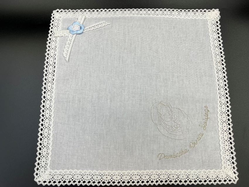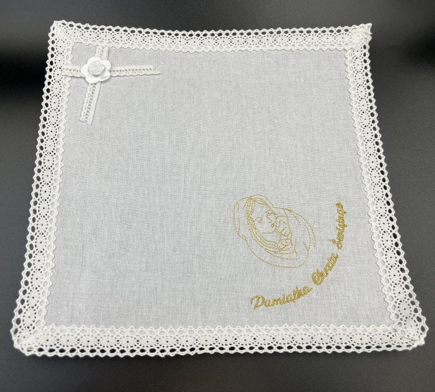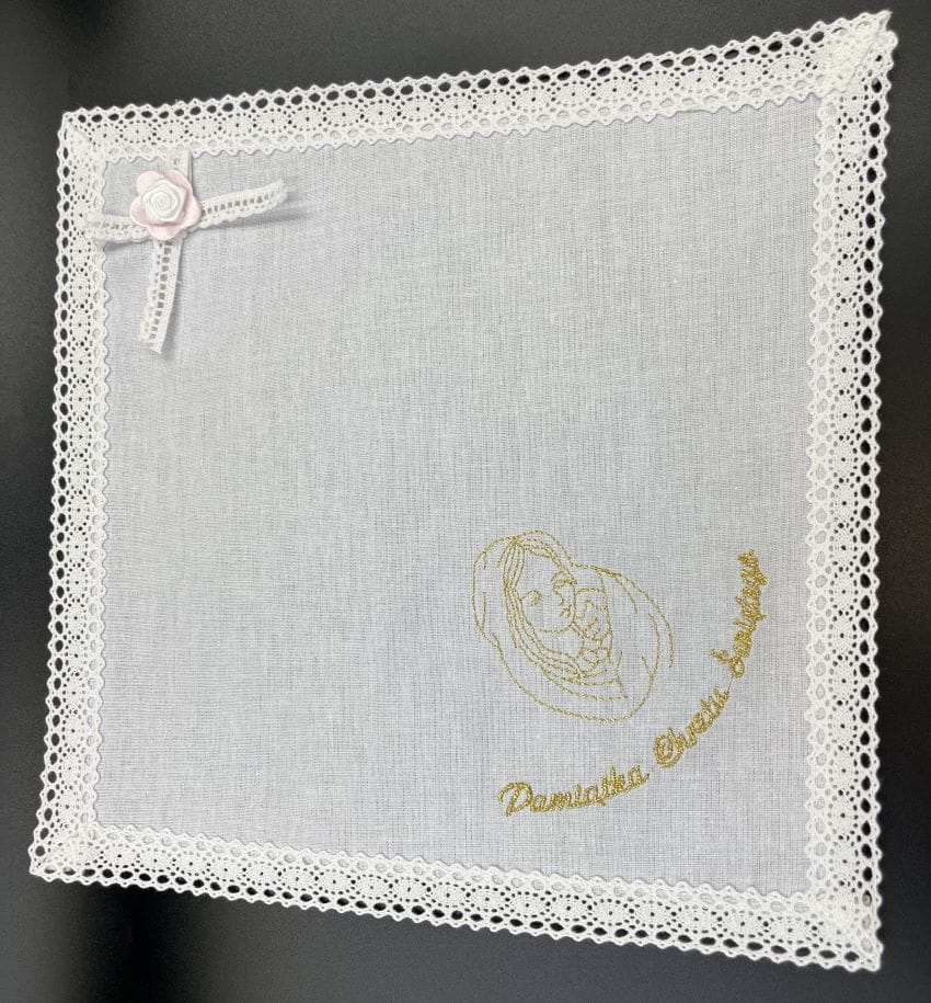 Szatka do chrztu z haftem wykonywanym srebrnymi lub złotymi nićmi. Starannie obszyta. Umieszczenie haftu może nieznacznie się różnić. Szatka z napisem Pamiątka Chrztu Świętego