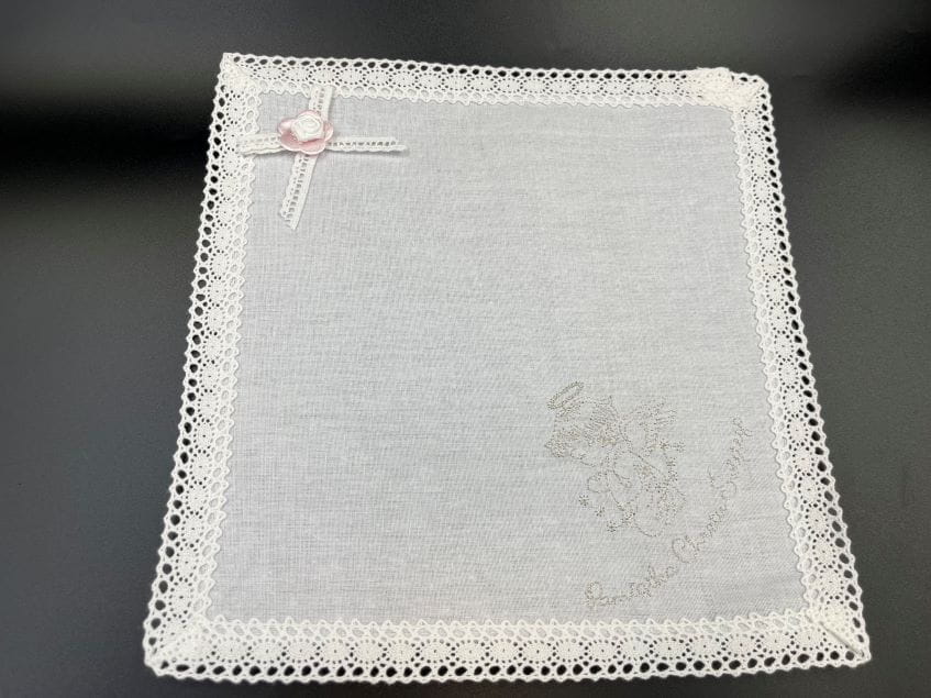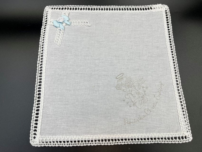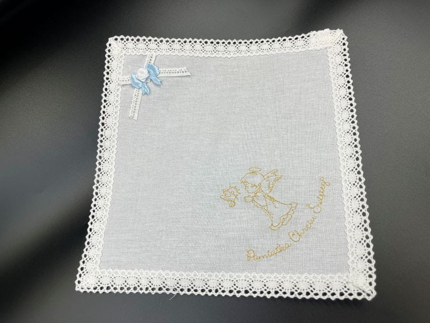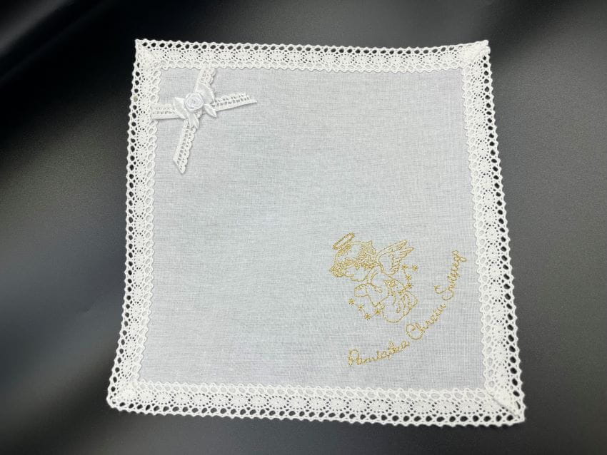 Szatka do chrztu z haftem wykonywanym srebrnymi lub złotymi nićmi.