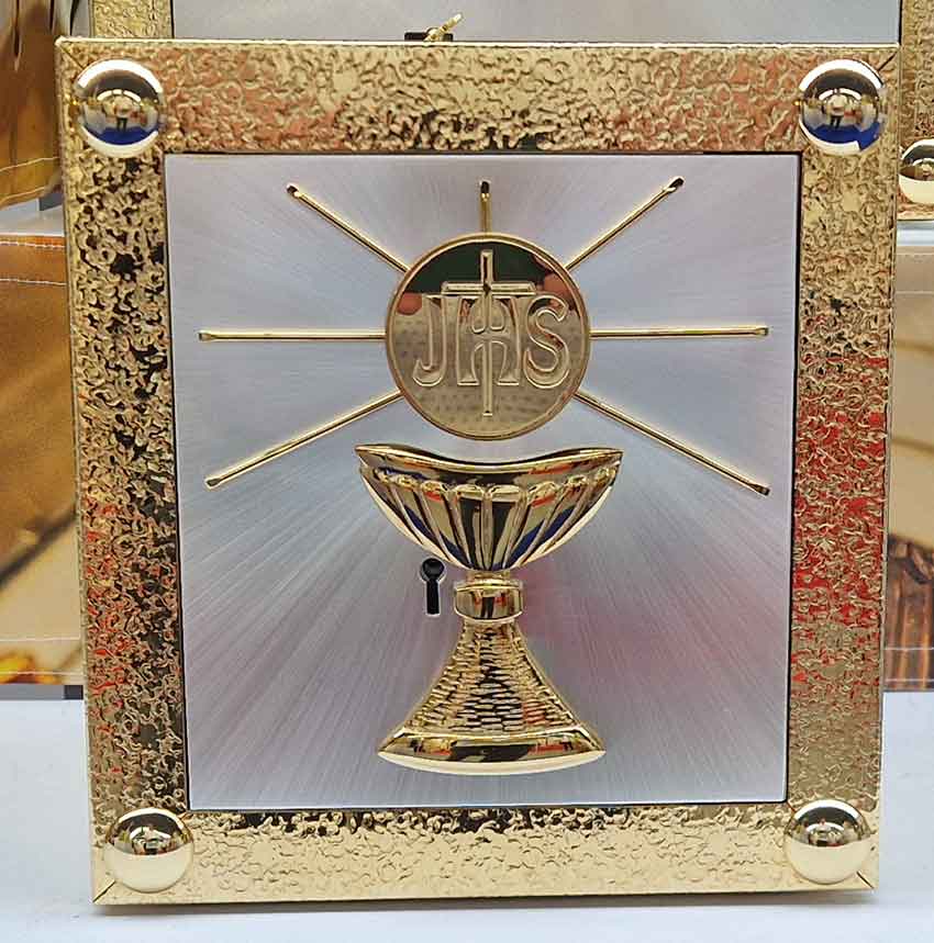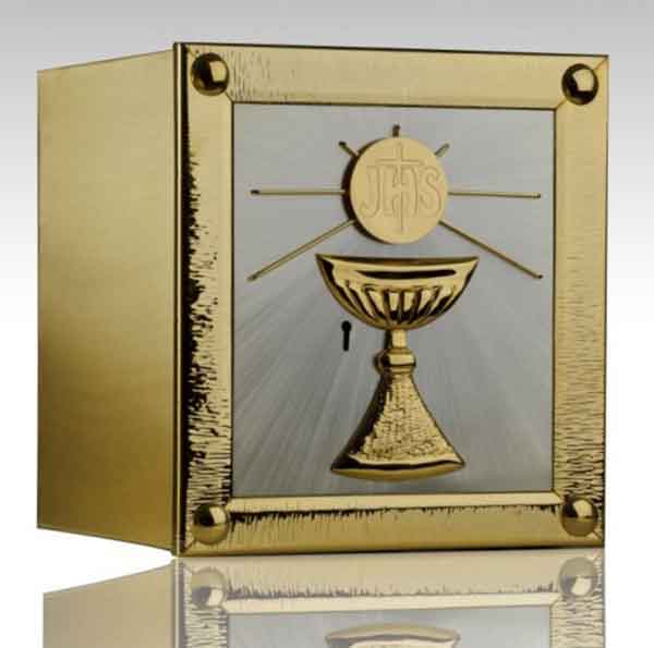 Mosiężne tabernakulum z metalowymi okuciami, zdobione IHS.