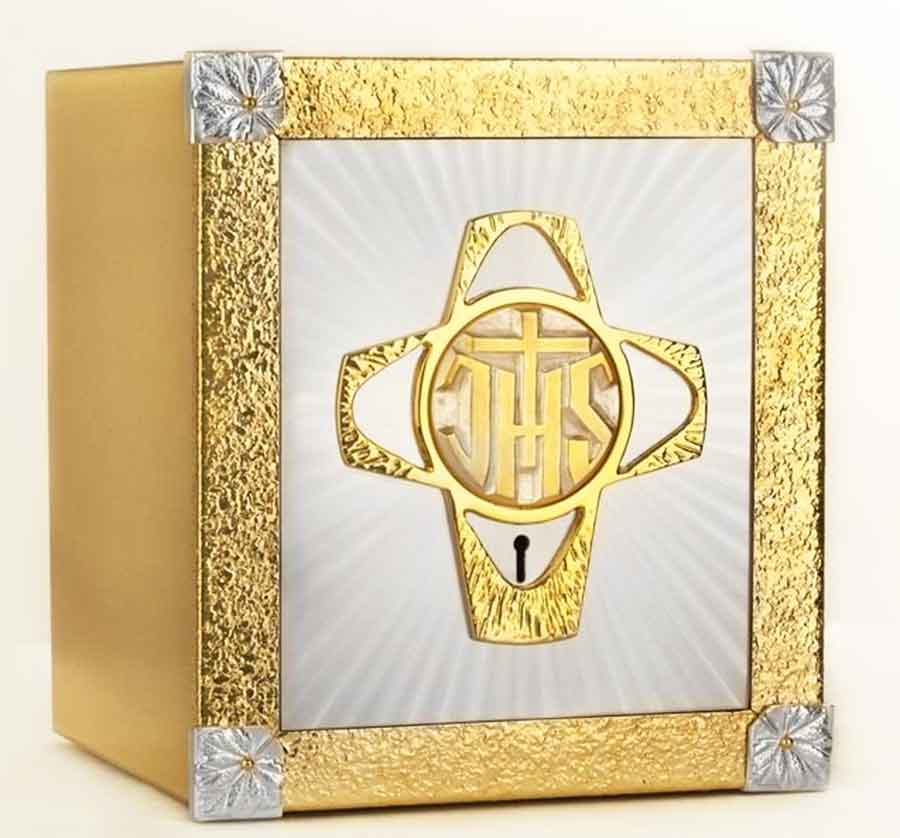 Mosiężne tabernakulum z metalowymi okuciami, zdobione IHS.