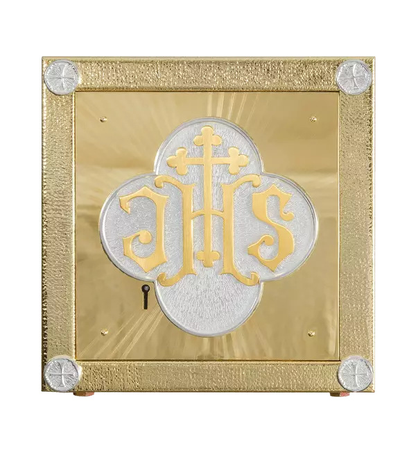 Mosiężne tabernakulum z metalowymi okuciami, zdobione motywem IHS.