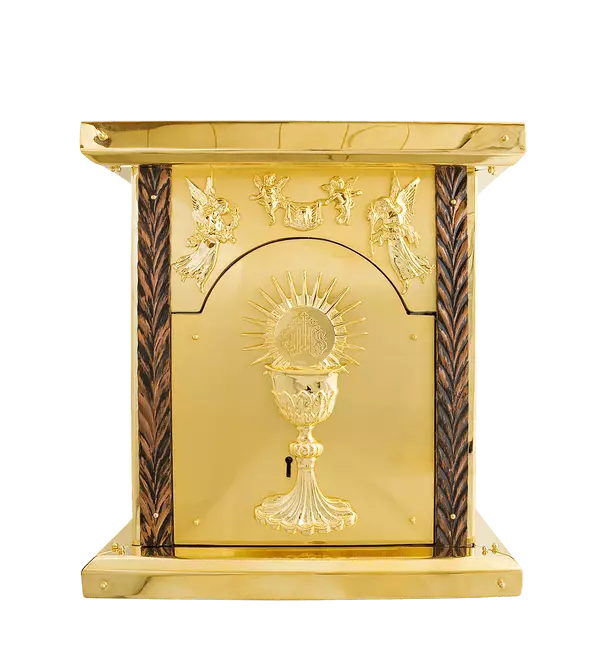 Mosiężne tabernakulum z metalowymi okuciami, piękne zdobienia na froncie.
