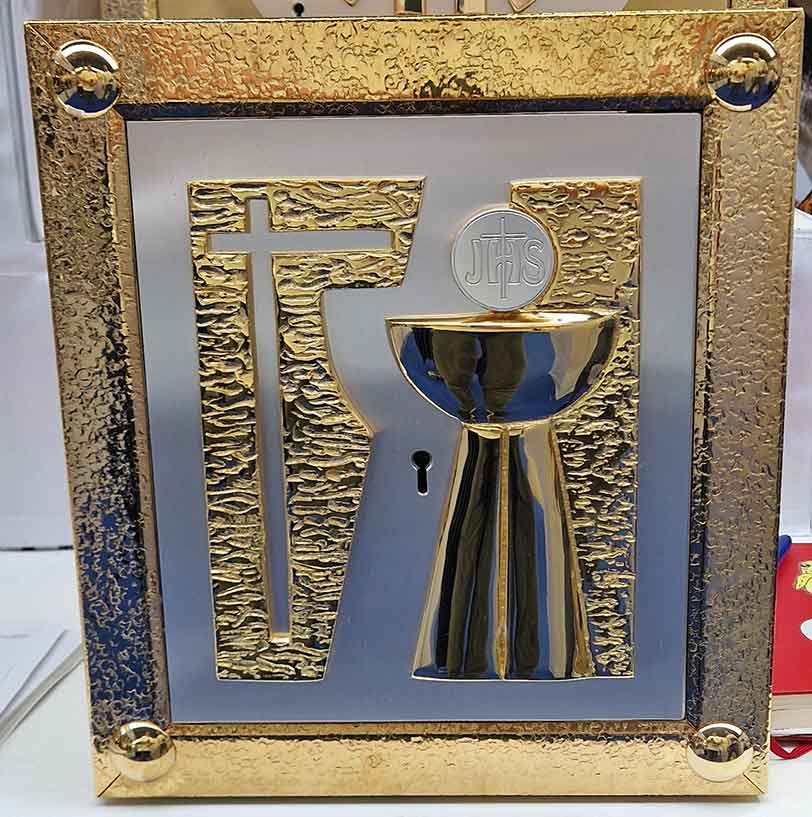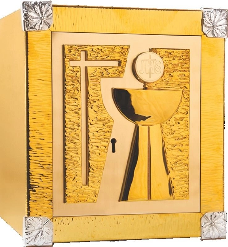 Wysokiej jakości produkt polski, tabernakulum mosiężne z okuciami, zdobione.