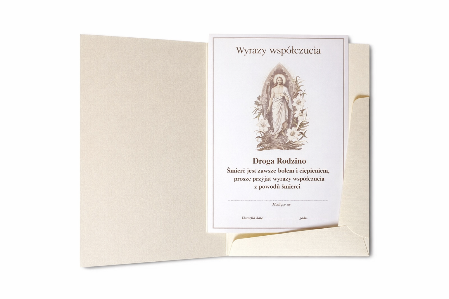 Elegancka teczka tekturowa przeznaczona do przechowywania i wręczenia wkładek kondolencyjnych lub pamiątkowych związanych z uroczystościami pogrzebowymi. Wykonana z wysokiej jakości, sztywnej tektury, zapewnia estetyczny wygląd oraz odpowiednią ochronę zawartości.