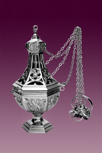 Trybularz gotycki mosiężny niklowany, łańcuchy ręcznie zaplatane.