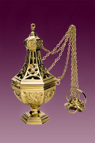 Trybularz gotycki mosiężny błyszczący, łańcuchy ręcznie zaplatane.