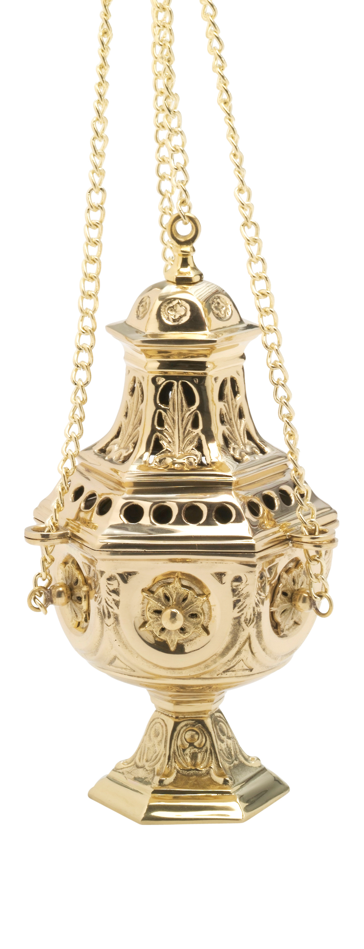 Trybularz wykonany z litego mosiądzu w eleganckim, złotym kolorze to klasyczna kadzielnica liturgiczna przeznaczona do palenia kadzidła podczas nabożeństw i uroczystości kościelnych. Bogato zdobiona forma oraz staranne wykończenie sprawiają, że naczynie prezentuje się niezwykle okazale i podkreśla uroczysty charakter liturgii.