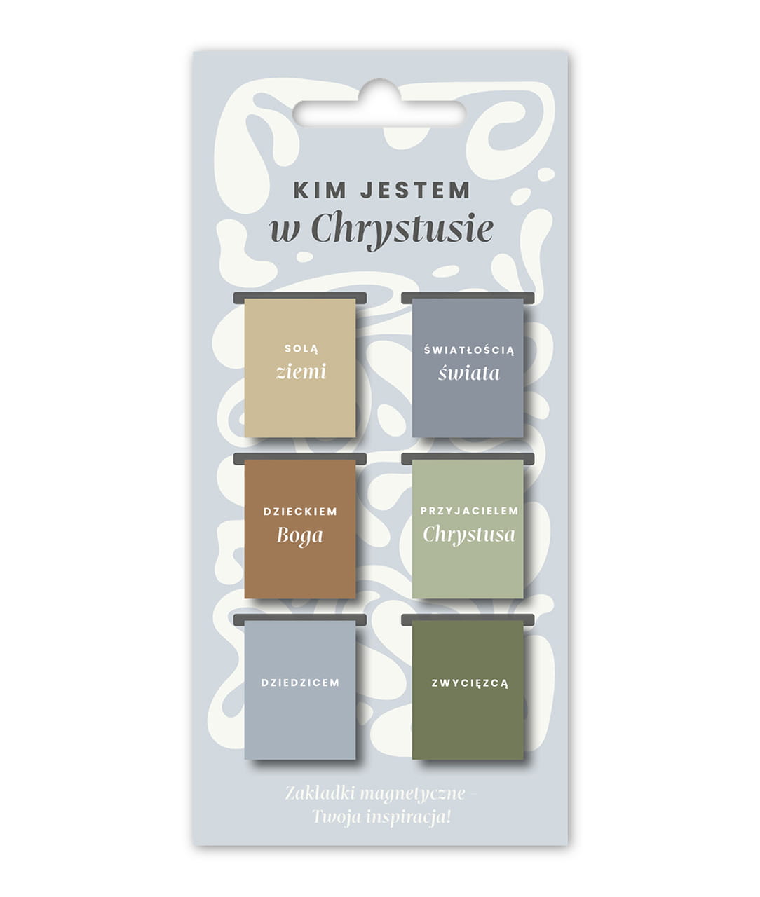Zestaw sześciu pięknych, magnetycznych zakładek inspirowanych Pismem Świętym, które przypominają o tożsamości każdego chrześcijanina w Jezusie Chrystusie. Idealne jako codzienna duchowa inspiracja podczas lektury Biblii, książek religijnych czy modlitewników.