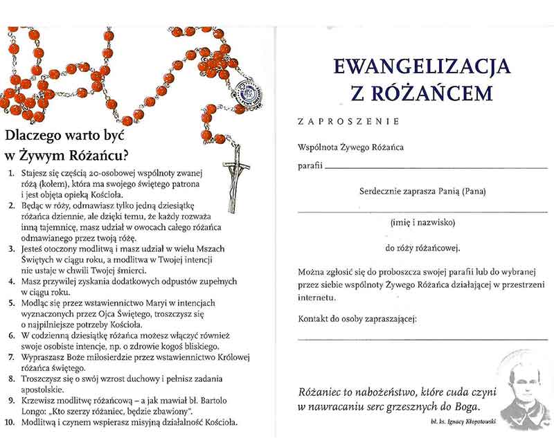 Oferujemy praktyczne narzędzie ewangelizacji – Zaproszenie do Żywego Różańca dla osoby, którą chcielibyśmy wprowadzić do wspólnoty. Warto także rozprowadzić zaproszenia wśród swoich znajomych, by ci z kolei mogli je podarować kolejnym osobom.
