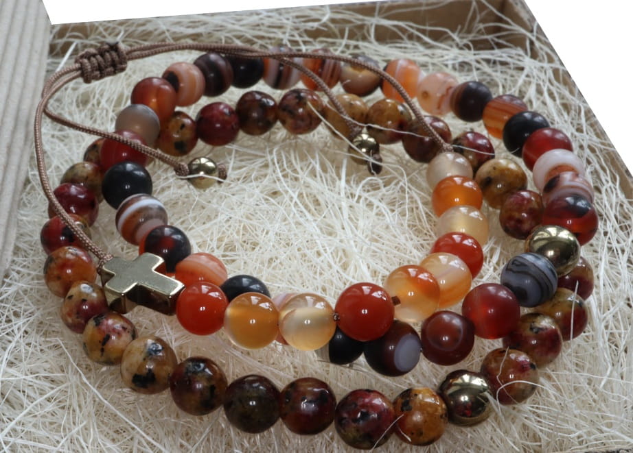 Zestaw dwóch eleganckich bransoletek i różańca na rękę z kamieni: