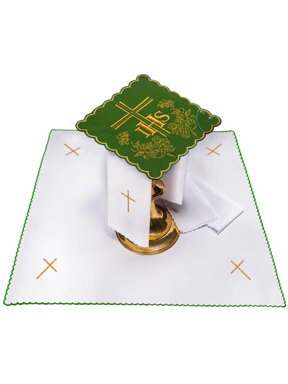 Bielizna kielichowa wykonana z wysokiej jakości tkaniny, zdobiona haftem z motywem eucharystycznym wykonanym złotymi nićmi, który przedstawia symbol IHS. Komplet składa się z czterech części: palki, korporału, puryfikaterza i ręczniczka. Dzięki łączącemu elementy motywowi z krzyżem, zestaw tworzy spójną całość.