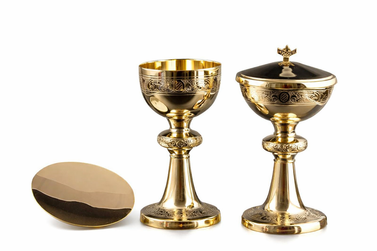 Elegancki zestaw liturgiczny o klasycznej, ponadczasowej formie, przeznaczony do godnego sprawowania Eucharystii oraz przechowywania konsekrowanych hostii. Starannie wykonany z mosiądzu, łączy trwałość z podniosłą, sakralną estetyką. Subtelne ornamenty, harmonijne proporcje oraz stabilne podstawy podkreślają liturgiczny charakter naczyń i zapewniają bezpieczeństwo użytkowania podczas celebracji.