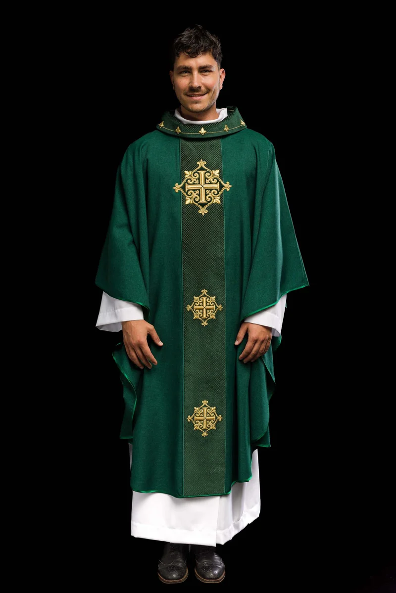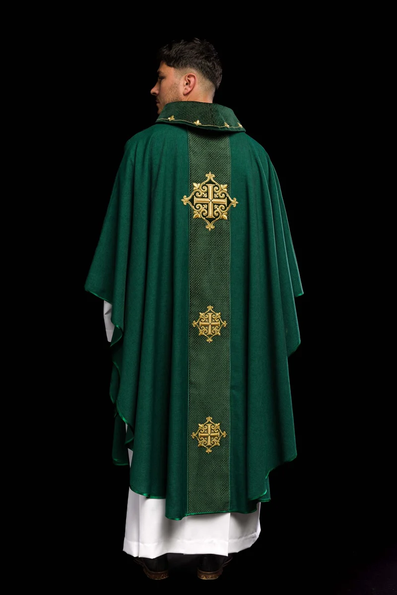 Elegancki ornat został starannie wykonany z aksamitnej tkaniny najwyższej jakości, a jego wyjątkowy design podkreślają haftowane symbole krzyża. Odpowiednio dobrana tkanina aksamitna nie tylko podkreśla wysoką jakość produktu, ale także nadaje mu niepowtarzalny, ekskluzywny charakter. Symbole krzyża, wykonane misternie techniką haftu, dodają ornatowi nie tylko piękna, ale także głębokiego znaczenia. To niezwykłe połączenie sprawia, że ten ornat to nie tylko strój liturgiczny, lecz także wyraz wysokiej estetyki i rzemiosła.