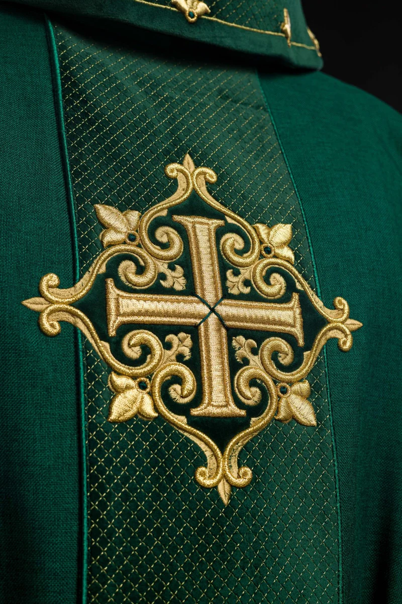 Ornat zielony z aksamitnym pasem i haftem krzyży